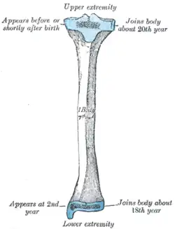 Le centre de l'épiphyse proximale apparaît avant ou peu après la naissance. Il est aplati et a un mince processus en forme de langue à l'avant, qui formera la tubérosité du tibia. Celle de l'épiphyse inférieure apparaît vers deux ans.