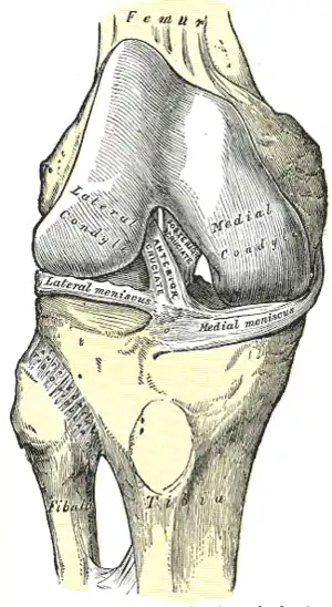 Les deux condyles s'articulent respectivement avec les condyles latéral et médial du fémur pour constituer l'articulation du genou.
