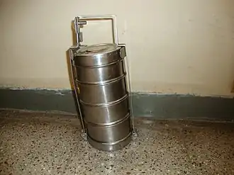 Normalement, ces récipients comportent deux ou trois étages, mais les versions plus élaborées peuvent en avoir quatre. L'étage inférieur, parfois plus grand que les autres, est celui qui est généralement utilisé pour le riz. Les porte-bagages s'ouvrent en déverrouillant un petit loquet de chaque côté de la poignée. Les porte-tabliers sont généralement fabriqués en acier et parfois en aluminium, mais des versions en émail et en plastique ont été fabriquées par des entreprises européennes.