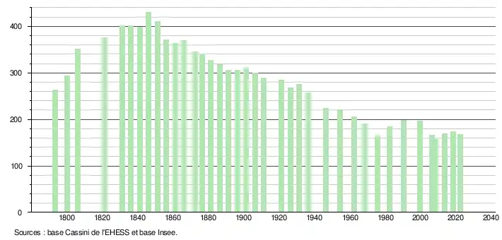 L'évolution du nombre d'habitants est connue à travers les recensements de la population effectués dans la commune depuis 1793. Pour les communes de moins de 10 000 habitants, une enquête de recensement portant sur toute la population est réalisée tous les cinq ans, les populations de référence des années intermédiaires étant quant à elles estimées par interpolation ou extrapolation[44]. Pour la commune, le premier recensement exhaustif entrant dans le cadre du nouveau dispositif a été réalisé en 2008[45].