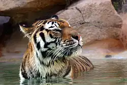 Les tigres aiment l'eau et se reposent souvent dans une mare ou un étang aux périodes chaudes de la journée[33].