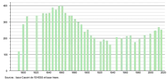 L'évolution du nombre d'habitants est connue à travers les recensements de la population effectués dans la commune depuis 1793. Pour les communes de moins de 10 000 habitants, une enquête de recensement portant sur toute la population est réalisée tous les cinq ans, les populations de référence des années intermédiaires étant quant à elles estimées par interpolation ou extrapolation[23]. Pour la commune, le premier recensement exhaustif entrant dans le cadre du nouveau dispositif a été réalisé en 2007[24].