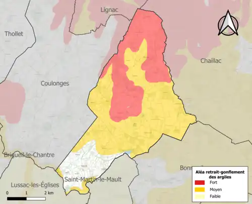 Le retrait-gonflement des sols argileux est susceptible d'engendrer des dommages importants aux bâtiments en cas d’alternance de périodes de sécheresse et de pluie. 86 % de la superficie communale est en aléa moyen ou fort (84,7 % au niveau départemental et 48,5 % au niveau national). Sur les 167 bâtiments dénombrés sur la commune en 2019, 143 sont en aléa moyen ou fort, soit 86 %, à comparer aux 86 % au niveau départemental et 54 % au niveau national. Une cartographie de l'exposition du territoire national au retrait gonflement des sols argileux est disponible sur le site du BRGM[19],[20].