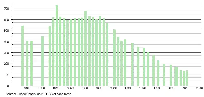 L'évolution du nombre d'habitants est connue à travers les recensements de la population effectués dans la commune depuis 1793. Pour les communes de moins de 10 000 habitants, une enquête de recensement portant sur toute la population est réalisée tous les cinq ans, les populations de référence des années intermédiaires étant quant à elles estimées par interpolation ou extrapolation[34]. Pour la commune, le premier recensement exhaustif entrant dans le cadre du nouveau dispositif a été réalisé en 2008[35].