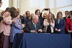 En , en réaction à l'arrêt Dobbs revenant sur le droit constitutionnel à l'avortement, Tim Walz signe une loi garantissant le droit à l'avortement au Minnesota[38]. Au cours du mois de mars, le Minnesota devient le quatrième État américain à adopter la gratuité des repas pour l'ensemble de ses élèves, petit-déjeuner compris[39]. Mise en place à partir de la rentrée de [39], la réforme rencontre un important succès mais se révèle plus coûteuse que prévu[40]. En , il promulgue une loi mettant en place jusqu'à 20 semaines de congés parentaux ou maladie à l'échelle de l'État à partir de 2026[41], financées par une taxe partagée entre les employeurs et les salariés[42]. Le même mois, il signe une loi légalisant la consommation de cannabis pour les adultes de plus de 21 ans[43] et une loi de sécurité publique renforçant notamment le contrôle des armes à feu, en permettant à un juge d'interdire le port d'armes à une personne dangereuse pour elle-même ou les autres et en étendant l'obligation de contrôle des antécédents lors d'un achat d'arme[44]. Toujours au printemps 2023, il signe deux lois en faveur du droit de vote, instaurant l'inscription automatique des 16 et 17 ans sur les listes électorales et rétablissant le droit de vote pour 60 000 anciens condamnés dès la fin de leur peine (et non plus après une période de probation d'un an)[37].