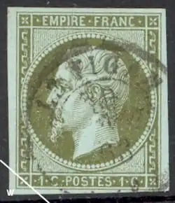 Le 1er novembre, est émis un timbre non dentelé de 1 centime de couleur olive sur un papier teinté en bleu pendant sa fabrication (dit « olive sur azuré »). Il est à l'effigie de l'empereur Napoléon III et légendé « EMPIRE FRANC ». Le type Napoléon III « Empire » est dessiné et gravé par Jacques-Jean Barre. Le timbre est imprimé en typographie en feuille de trois cents exemplaires.