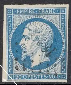 En septembre[3], apparaît un timbre non dentelé de 20 centimes bleu à l'effigie de l'empereur Napoléon III et légendé « EMPIRE FRANC ». Pour réparer les galvanos nécessaires à l'impression, un nouveau poinçon est réalisé en 1860. Bien que la nouvelle gravure se veuille aussi proche du type 1 que possible, des différences se remarquent dans le dessin et fait de ce 20 centimes de 1860 un deuxième type : à deux emplacements (sommet du front et à gauche de l'oreille), les traits représentant les cheveux sont différents entre les deux types. Les deux types se retrouvent ensemble dans les feuilles imprimées[4].