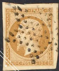 En septembre, est mis en circulation un timbre non dentelé de 10 centimes brun clair à l'effigie de l'empereur Napoléon III et légendé « EMPIRE FRANC ». Il se substitue au timbre presque identique de 10 centimes bistre émis en décembre 1853 : la nuance de couleur change et le 10 centimes de 1860 est au type 2 car le poinçon nécessaire à la fabrication des galvanos a été refait. Bien que cette nouvelle gravure se veut aussi proche de l'original que possible, des différences se remarquent dans le dessin : à deux emplacements (sommet du front et à gauche de l'oreille), les traits représentant les cheveux sont différents entre les deux types.