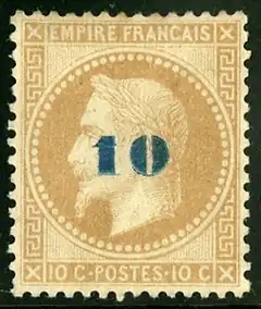 Le 10 c. bistre lauré (de 1863, type 2 à « gros points ») fut surchargé d'un « 10 » de couleur bleu foncé, répétant sa valeur faciale. L'origine de ces timbres non émis est toujours sujet de discussions. Plusieurs hypothèses existent :