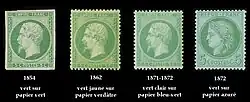 - ↑ Papier teinté dans la masse en bleuté que l'on reconnait donc facilement de dos en comparant avec un timbre à 1 centime "lauré". Ce papier a probablement été utilisé à la suite de l'épuisement du stock à l'atelier et chez le fournisseur de papier teinté vert-jaune normalement utilisé pour le 5 centimes vert-jaune sur vert.