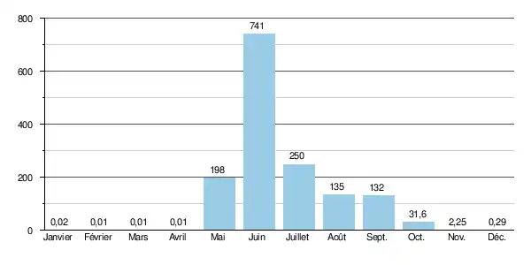 Le débit moyen mensuel observé de février à avril (minimum d'étiage) est réduit à sa plus simple expression avec pas plus de 0,01 m3/s, soit 10 litres par seconde et souvent zéro. Par contre le débit moyen du mois de juin atteint 741 m3/s, ce qui souligne l'amplitude extrême des variations saisonnières, même dans le contexte sibérien où les écarts sont souvent très importants. Ces écarts de débit mensuel peuvent être encore plus marqués d'après les années. Ainsi sur la durée d'observation de 37 ans, le débit mensuel minimal a été de 0,00 m3/s à de nombreuses reprises entre décembre et avril, tandis que le débit mensuel maximal s'élevait à 1 530 m3/s en .