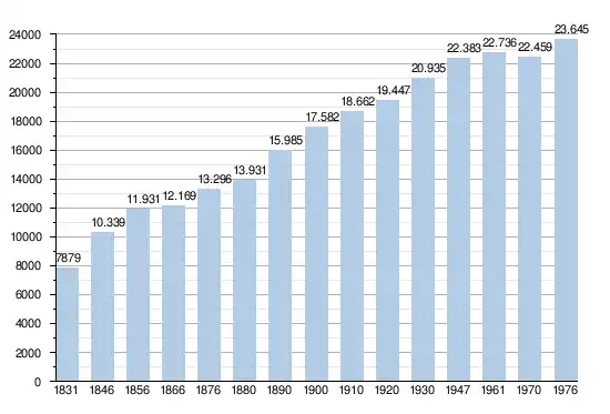 Les chiffres des années 1831 à 1970 tiennent compte des chiffres des anciennes communes fusionnées.