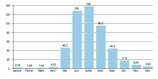 Le débit moyen mensuel observé en février (minimum d'étiage) est de 1,58 m3/s, soit seulement 1,15 % du débit moyen du mois de juillet (138 m3/s), ce qui souligne l'amplitude extrêmement élevée des variations saisonnières. Et ces écarts de débit mensuel peuvent être encore plus importants d'après les années. Ainsi sur la durée d'observation de 11 ans, le débit mensuel minimal a été de 0,80 m3/s en , tandis que le débit mensuel maximal s'élevait à 210 m3/s en .