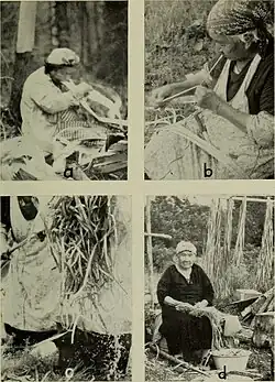 Après que l'écorce de Cèdre de l'Ouest (Thuja plicata) ou de Cyprès de Nootka (Cupressus nootkatensis) a été pelée en de longues bandes à partir des arbres, la couche extérieure est séparée et la couche intérieure flexible est déchiquetée et traitée. Les bandes d'écorces feutrées qui en résultent sont douces et peuvent être tressées, cousues ou tissées dans une variété de tissus et nattes qui sont denses et étanches, ou doux et confortables.