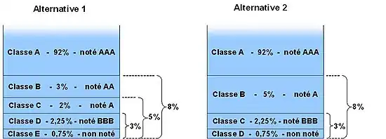 Par ailleurs, afin de revendre des titres de qualité, le gestionnaire de portefeuille fait faire une évaluation des risques de non-paiement par l'établissement financier qui structure l'opération et, généralement, par au moins deux agences de notation financière. Un montant équivalent au premier risque (qui a le plus de chances de se produire) est constitué en titres secondaires subordonnés aux titres principaux et qui subiront les premières pertes du portefeuille. Ils sont alors généralement vendus à l'entreprise cédante, qui garde ainsi à sa charge le premier risque de non-paiement de ses créances, la qualité des titres principaux s'en trouvant d'autant augmentée. Le plus souvent, les titres principaux sont eux-mêmes scindés en différentes classes subordonnées entre elles, chaque classe de titre présentant un profil de risque distinct, plus ou moins élevé, sanctionné par une notation de qualité donnée par les agences de notation et qui permet aux investisseurs d'évaluer leur risque (voir section Structuration financière des opérations).
