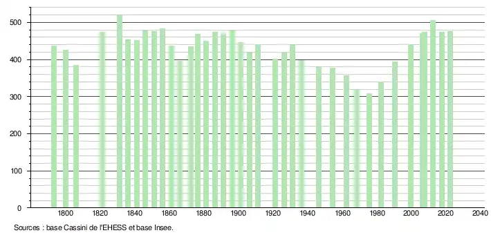| L'évolution du nombre d'habitants est connue à travers les recensements de la population effectués dans la commune depuis 1793. Pour les communes de moins de 10 000 habitants, une enquête de recensement portant sur toute la population est réalisée tous les cinq ans, les populations de référence des années intermédiaires étant quant à elles estimées par interpolation ou extrapolation[23]. Pour la commune, le premier recensement exhaustif entrant dans le cadre du nouveau dispositif a été réalisé en 2007[24]. En 2022, la commune comptait 475 habitants[Note 2], en évolution de −1,45 % par rapport à 2016 (Gironde : +6,91 %, France hors Mayotte : +2,11 %). |