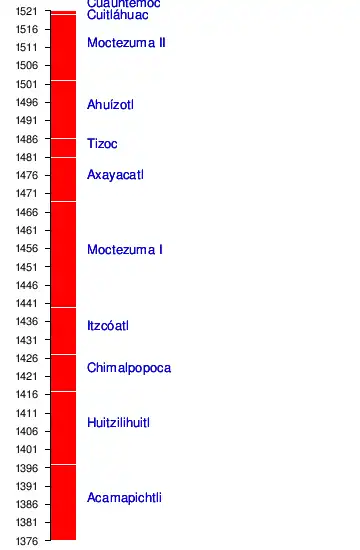 | Axayacatl ? - 1481 | Tizoc ? - 1486 | Ahuitzotl ? - 1502 | |||||||||||||||||||||||||||||||||||||||||