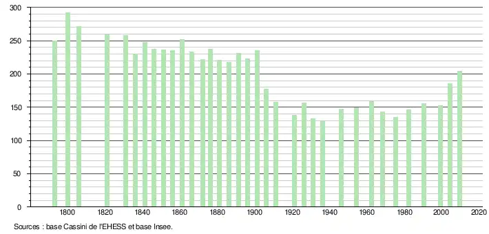 - ↑ Par convention dans Wikipédia, le principe a été retenu de n’afficher dans le tableau des recensements et le graphique, pour les populations légales postérieures à 1999, que les populations correspondant à une enquête exhaustive de recensement pour les communes de moins de 10 000 habitants, et que les populations des années 2006, 2011, 2016, etc. pour les communes de plus de 10 000 habitants, ainsi que la dernière population légale publiée par l’Insee pour l'ensemble des communes.