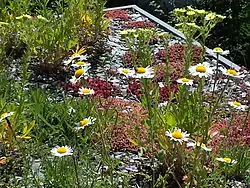 - De nombreux effets bénéfiques sur la biodiversité. Une partie de la vie sauvage retrouve des habitats de substitution, et des équilibres naturels se recréent. Sur les terrasses extensivement végétalisées, les plantes les plus adaptées sont les plantes de milieux secs et oligotrophes qui sont justement menacées de disparition à cause de l’eutrophisation générale des milieux. Certains cortèges faunistiques associés trouvent ainsi des îlots où leur survie est possible[24]. On peut également associer un rucher à la toiture végétalisée, ce qui permet notamment la réintroduction des abeilles en ville, indispensables à la pollinisation de certains végétaux. Quand une partie au moins des espèces installées est autochtone, la biodiversité en profite, avec par exemple à Londres sur un site étudié en pleine ville (zone du « Canary Wharf et environs » qui inclut des buildings dépassant 50 m) près de 136 espèces d'invertébrés[25] dits « tecticoles » (typiques des jardins alpins et des rocailles) dont coléoptères, hémiptères, arachnides, … qui colonisent la niche écologique offerte par les tapis de sedum (Sedum album, S. acre, S. reflexum, S. spurium, S. pulchellum, S. sexangulare, S. hispanicum, S. kamtschaticum, saxifrages (Saxifraga granulata) et autres plantes. Dans ce cas, des campanules sont aussi apparues[26]. Des invertébrés peu communs profitent de ces milieux[27].