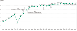 - les « Aires kilométriques de Tokyo »[l 5] est une autre définition utilisée par le Bureau des Statistiques, quoique moins répandue car moins fiable. Il s'agit des municipalités comprises en totalité ou partiellement dans des cercles concentriques de rayon croissant par paliers de 10 km, jusqu'à un rayon maximum de 70 km, par rapport à l'ancien siège du gouvernement métropolitain de Tokyo à Chiyoda. Les recensements de population établissent pour Tokyo deux chiffres : celui des 70 km de rayon, appelée Aire des 70 km de Tokyo[l 6] qui est la donnée la plus large censée s'approcher le plus d'un Grand Tokyo sur un plan presque géométrique, et celui du rayon des 50 km de rayon, appelée Aire des 50 km de Tokyo[l 7] ou encore « Aire métropolitaine majeure de Tokyo »[l 8],[22]. Cette donnée ne comprend donc pas les nouvelles zones périurbaines qui s'étendent au-delà en doigt de gant le long des principaux axes de communication, et inclut de même de nombreuses zones entièrement rurales. Elle constituait un ensemble de 31,714 millions d'habitants (pour le rayon de 50 km) en 2005[23] (30 724 311 en 2000) et de 34,394 millions (pour le rayon de 70 km) en 2000 ;