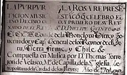 - ↑ Samuel Claro Valdés, « La música secular de Tomás de Torrejón y Velasco (1644-1728) - Algunas características de su estilo y notación musical », article écrit à Santiago du Chili en janvier 1969, publié : Revista musical chilena, Vol. 26, no 117, 1972, pp. 3-23, p. 3 (es)