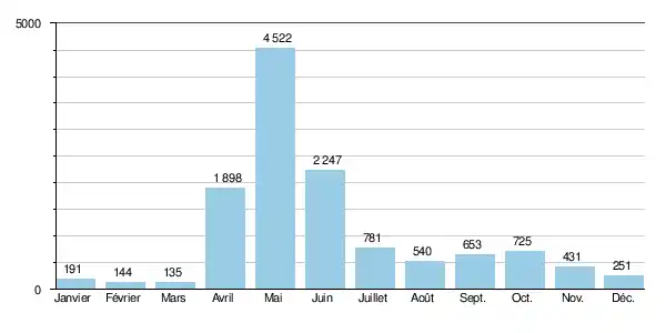 Les hautes eaux se déroulent au printemps et au début de l'été, du mois d'avril au mois de juin, ce qui correspond au dégel et à la fonte des neiges du bassin. Dès le mois de juin, le débit baisse fortement, mais reste assez confortable tout au long du reste de l'été et de l'automne. Un net rebond, de moyenne ampleur, a lieu aux mois d'octobre et de septembre, et est lié aux précipitations automnales ainsi qu'à la moindre évaporation en cette saison.