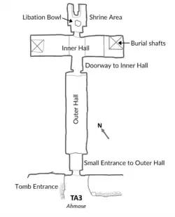 Le hall intérieur mène à l'arrière de la tombe, où se trouve la zone du sanctuaire. Le segment supérieur du linteau de la porte du sanctuaire est décoré d'une sculpture de l'uræus[5]. La partie inférieure montre des sculptures inachevées d'une ligne de piliers Djed[10]. Le sanctuaire abrite une statue en calcaire inachevée et défigurée d'Ahmès. Dans cette statue-niche, la figure d'Ahmès est assise, une pose caractéristique de la sculpture funéraire égyptienne qui symbolise une volonté de recevoir des offrandes[11]. Les recoins vides de la statue de pierre étaient autrefois constitués d'éléments décoratifs colorés taillés dans la faïence[10]. Un bol à libation peu profond est sculpté dans le sol au pied de la statue, utilisé pour les offrandes religieuses aux dieux[5]. La zone du sanctuaire était fermée par des portes pliantes en bois. Le mur latéral de la statue-niche a été taillé dans un carré parfait, démontrant le savoir-faire de la maçonnerie en pierre[5]. Dans toute la tombe, les murs non décorés sont principalement couverts de graffitis grecs, qui ont été gravés dans le plâtre.