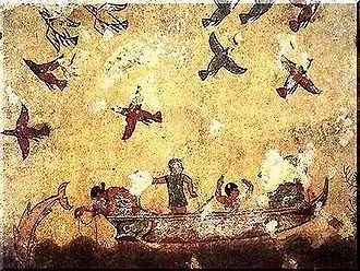 - 1 2 3 4 R. Ross Holloway, « Conventions of Etruscan Painting in the Tomb of Hunting and Fishing at Tarquinii », American Journal of Archaeology, vol. 69, no 4, , p. 341–347 (JSTOR 502183)
