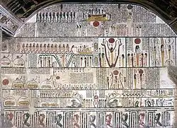 - dans la chambre funéraire, où ne subsiste aujourd'hui qu'un sarcophage brisé, les parois sont ornées du Livre de la terre et de celui du jour et de la nuit. Le plafond astronomique représente Nout sous un double aspect de jour et de nuit, reproduisant ainsi le cycle perpétuel de la renaissance du Soleil.