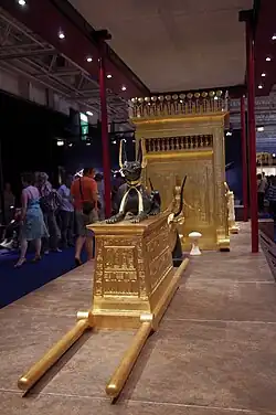 La chambre mortuaire contenait un immense catafalque lui aussi exposé en grande partie dans le musée égyptien : quatre coffres-chapelles gigognes en bois doré dépourvus de plancher, en bois stuqué et doré, se succèdent à partir du haut, offrant une protection maximale au pharaon qui reposait, selon la mentalité religieuse égyptienne, dans sa « maison d'éternité »[37]. Les chapelles (appelées ainsi car elles représentent l'architecture typique de sanctuaires, en modèle réduit, et contiennent des objets de la vie quotidienne qui aidaient le défunt à reconstituer son univers) sont constituées de grands panneaux de bois de cèdre assemblés par des tenons en chêne. Elles sont fermées à l'est par une porte à double battant, leurs verrous sont composés de tiges en ébène coulissant à l'intérieur d'anneaux de cuivre revêtus d'argent. Deux autres anneaux étaient entourés de cordelettes marquées de sceaux imprimés en argile, à l'exception de celui de la porte de la chapelle extérieure qui était brisé, trace du passage des pilleurs.