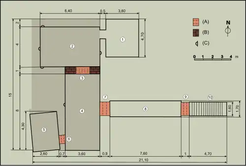 Sur le mur de droite, des traces de creusement abandonné indiquent que cette pièce aurait dû être plus grande d'environ deux mètres vers le nord. Sur le mur du fond à gauche, une petite porte surmontée de traits noirs délimitant l'ouverture qu'elle aurait dû avoir, permet d'accéder à une autre chambre.