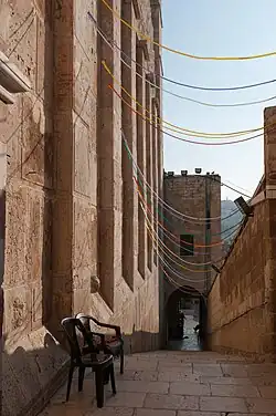 - une synagogue, lieu de culte juif, occupe les trois cinquièmes du monument dans sa partie nord-ouest ; elle comprend une cour autour de laquelle sont construits des bâtiments ;