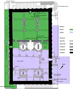 - les deux cinquièmes restants dans la partie sud-est constituent la salle de prière de la mosquée musulmane. L'accès à celle-ci est sous contrôle israélien[2],[3].