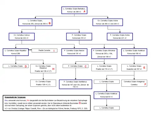 L'inscription du sarcophage (CIL VI 1296) (ou CIL I², 12)[15], conservée au Vatican, est celle de Lucius Cornelius L.f. P.n. Scipio, appartenant probablement à la seconde génération des Cornelii Scipiones Asiatici (en:Lucius Cornelius Scipio Asiaticus#Lucius Cornelius Scipio Asiaticus II).