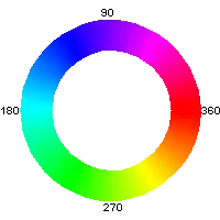 On repère ordinairement les teintes en considérant que les couleurs primaires sont également espacées, avec le rouge primaire à 0°, le vert primaire à 120°, le bleu primaire à 240°, et les mélanges, à des angles intermédiaires, en proportion des deux primaires qui les composent. Ce repérage nécessite peu de calculs, mais il ne correspond pas à une évaluation colorimétrique, du fait de la non-linéarité des signaux de couleur sRGB en informatique.