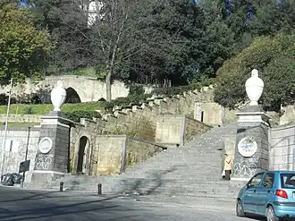 Un peu plus loin s'ouvre l'escalier monumental, officiellement appelé Gradini de Capodimonte, qui permet d'accéder aux jardins toujours construits par Niccolini. À l'époque fasciste, ils ont été nommés d'après la princesse Iolanda Margherita de Savoie. Du tondo, on aperçoit les décorations sur les côtés de l'escalier: sur deux grands piliers, il y a deux baldaquins en marbre égyptien et deux guirlandes, à gauche les jardins, à droite le blason de la municipalité et de la maison de Savoie.