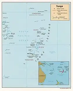 Les Tonga[5], en forme longue le royaume des Tonga[6] (en tongien : Tonga, /ˈtoŋa/ et Pule'anga Fakatu'i 'o Tonga ; en anglais : Tonga et Kingdom of Tonga), sont un État de Polynésie, situé dans l'Ouest de l'océan Pacifique sud, à 744 km à l'est-sud-est des îles Fidji et à 875 km au sud de Wallis-et-Futuna. Le pays est réparti en trois archipels principaux comportant plus de 170 îles et îlots.