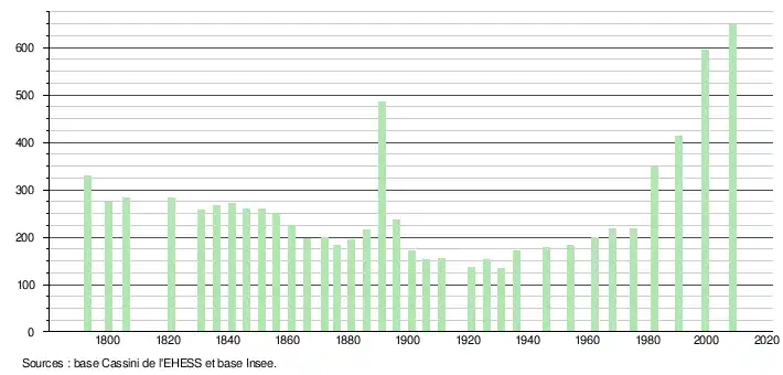 - ↑ Par convention dans Wikipédia, le principe a été retenu de n’afficher dans le tableau des recensements et le graphique, pour les populations légales postérieures à 1999, que les populations correspondant à une enquête exhaustive de recensement pour les communes de moins de 10 000 habitants, et que les populations des années 2006, 2011, 2016, etc. pour les communes de plus de 10 000 habitants, ainsi que la dernière population légale publiée par l’Insee pour l'ensemble des communes.