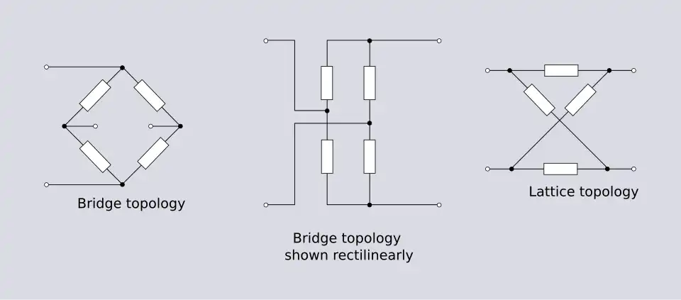 Il est normal de qualifier un réseau de topologie de pont uniquement si on l'utilise comme un réseau à deux ports où les ports d'entrée et de sortie sont chacun constitués d'une paire de nœuds diagonalement opposés. On peut considérer la topologie de boîte de la figure 1.7 identique à la topologie de pont, mais dans le cas du filtre, les ports d'entrée et de sortie seront chacun une paire de nœuds adjacents. On inclut parfois dans la topologie de pont la composante de chargement (ou d'indication nulle) sur le port de sortie du pont, tel qu'illustré à la figure 1.9[7].