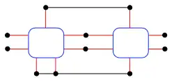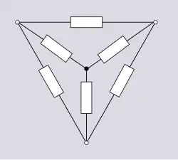 Un exemple d'un tel réseau est illustré à la figure 1.6, où on a un réseau Y connecté en parallèle avec un réseau Δ. Supposons que l'on veuille calculer l'impédance entre deux nœuds du réseau. Souvent, cela peut se faire par applications successives des règles de combinaison des impédances série ou parallèle. C'est toutefois impossible dans ce réseau, car il faut utiliser la transformée Y-Δ en plus des règles en série et parallèle[4]. La topologie Y se nomme également topologie en étoile. Cependant, la topologie en étoile peut aussi référer au cas plus général de n mailles connectées au même nœud plutôt que trois[5].