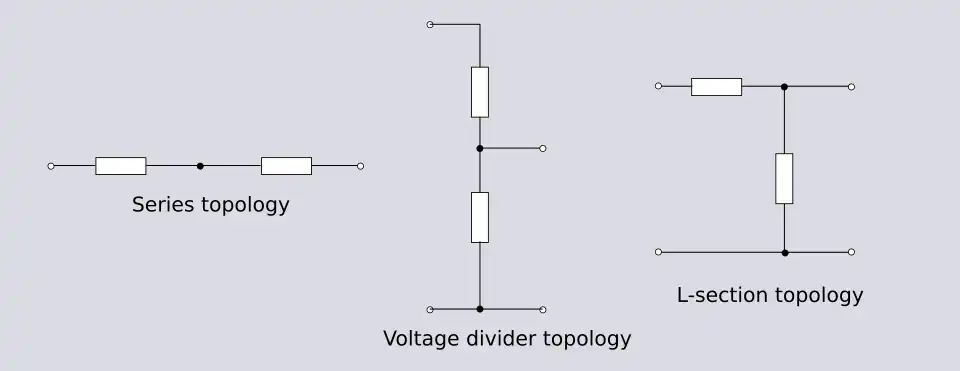 Les topologies dans la figure 1.7 sont communément utilisées dans la conception de filtres et d'atténuateurs. La topologie en L est identique à celle du diviseur de potentiel. La topologie en T est identique à celle en Y. La topologie en Π est identique à celle en Δ.