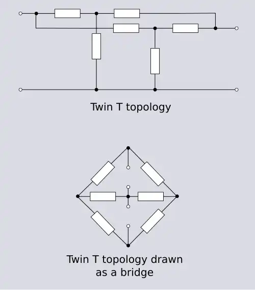Une topologie à double T existe aussi avec des applications pratiques où il est souhaitable que les entrées et les sorties partagent une borne de masse. Un exemple d'un tel cas est lorsque les connexions d'entrée et de sortie sont faites avec une topologie coaxiale. Une topologie de pont normale ne permet pas la connexion entre une borne d'entrée et de sortie. Pour cette raison, la topologie à double T est utilisée dans les cas où un pont serait par ailleurs utilisé pour des applications d'équilibrage ou de mesure nulle. Cette topologie est également utilisée dans l' oscillateur à double T comme générateur d'onde sinusoïdale. La partie inférieure de la figure 1.11 montre une topologie à double T redessinée dans le but de souligner la connexion avec la topologie de pont[8].