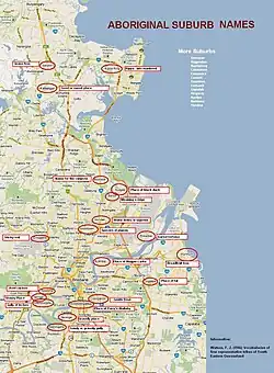 Des toponymes aborigènes australiens mis en évidence sur une carte de Brisbane, ou le couplage des fonctions pratique et mémorielle.