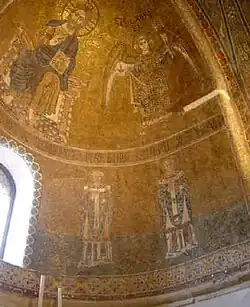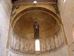 2/ Dans le cul-de-four figure la Vierge à l'Enfant (XIIIe siècle), la fenêtre centrale inférieure représentant le Christ. Comme il était d'usage dans la symbolique religieuse byzantine, la Vierge amorce une génuflexion. Elle tient le Suaire du Christ, alors que l'enfant tient le rouleau de la loi, qui figure une triple ascendance temporelle, traditionnelle et spirituelle. Une abréviation grecque au-dessus de la Vierge signifie "Mère de Dieu". En dessous, les Apôtres avancent dans une prairie de coquelicots (XIIe siècle).