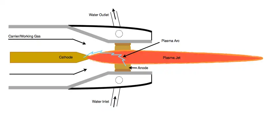Il s'agit d'un plasma d'arc transféré ou non transféré. L'un des pieds de l'arc reste à l'intérieur de la torche, accroché sur une électrode en pointe (généralement en tungstène ou hafnium) et l'autre pied d'arc est accroché au support à découper (cas de l'arc transféré) ou sur une électrode tubulaire (cas de la projection thermique de céramique).