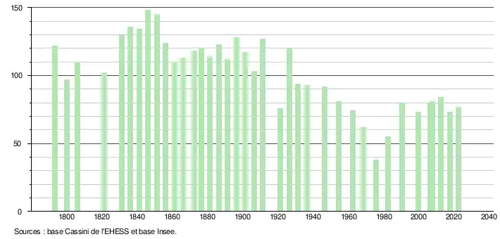 L'évolution du nombre d'habitants est connue à travers les recensements de la population effectués dans la commune depuis 1793. Pour les communes de moins de 10 000 habitants, une enquête de recensement portant sur toute la population est réalisée tous les cinq ans, les populations de référence des années intermédiaires étant quant à elles estimées par interpolation ou extrapolation[23]. Pour la commune, le premier recensement exhaustif entrant dans le cadre du nouveau dispositif a été réalisé en 2007[24].