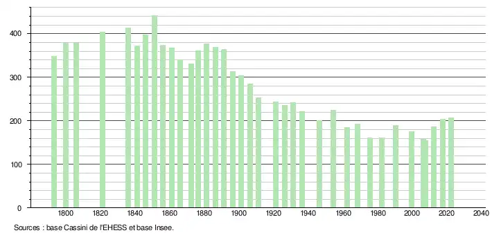 L'évolution du nombre d'habitants est connue à travers les recensements de la population effectués dans la commune depuis 1793. Pour les communes de moins de 10 000 habitants, une enquête de recensement portant sur toute la population est réalisée tous les cinq ans, les populations de référence des années intermédiaires étant quant à elles estimées par interpolation ou extrapolation[12]. Pour la commune, le premier recensement exhaustif entrant dans le cadre du nouveau dispositif a été réalisé en 2007[13].