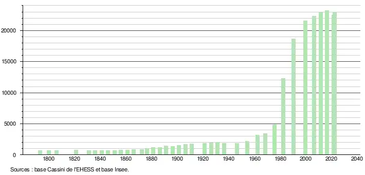 ↑ Par convention dans Wikipédia, le principe a été retenu de n’afficher dans le tableau des recensements et le graphique, pour les populations de référence postérieures à 1999, que les populations correspondant à une enquête exhaustive de recensement pour les communes de moins de 10000habitants, et que les populations des années 2006, 2011, 2016, etc. pour les communes de plus de 10000habitants, ainsi que la dernière population de référence publiée par l’Insee pour l'ensemble des communes.