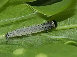 Aux 3e et 4e stades larvaires, les chenilles sont gris-verdâtre à vert olive clair, et portent des points noirs sur le corps. Elles se cachent dans des feuilles qu’elles ont pliées et collées et s’en nourrissent. Si elles se sentent menacées elles se laissent tomber au bout d’un long fil de soie.