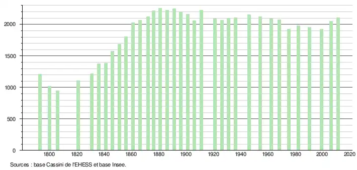 L'évolution du nombre d'habitants est connue à travers les recensements de la population effectués dans la commune depuis 1793. À partir du , les populations légales des communes sont publiées annuellement dans le cadre d'un recensement qui repose désormais sur une collecte d'information annuelle, concernant successivement tous les territoires communaux au cours d'une période de cinq ans. Pour les communes de moins de 10 000 habitants, une enquête de recensement portant sur toute la population est réalisée tous les cinq ans, les populations légales des années intermédiaires étant quant à elles estimées par interpolation ou extrapolation[13]. Pour la commune, le premier recensement exhaustif entrant dans le cadre du nouveau dispositif a été réalisé en 2006[14],[Note 1].
